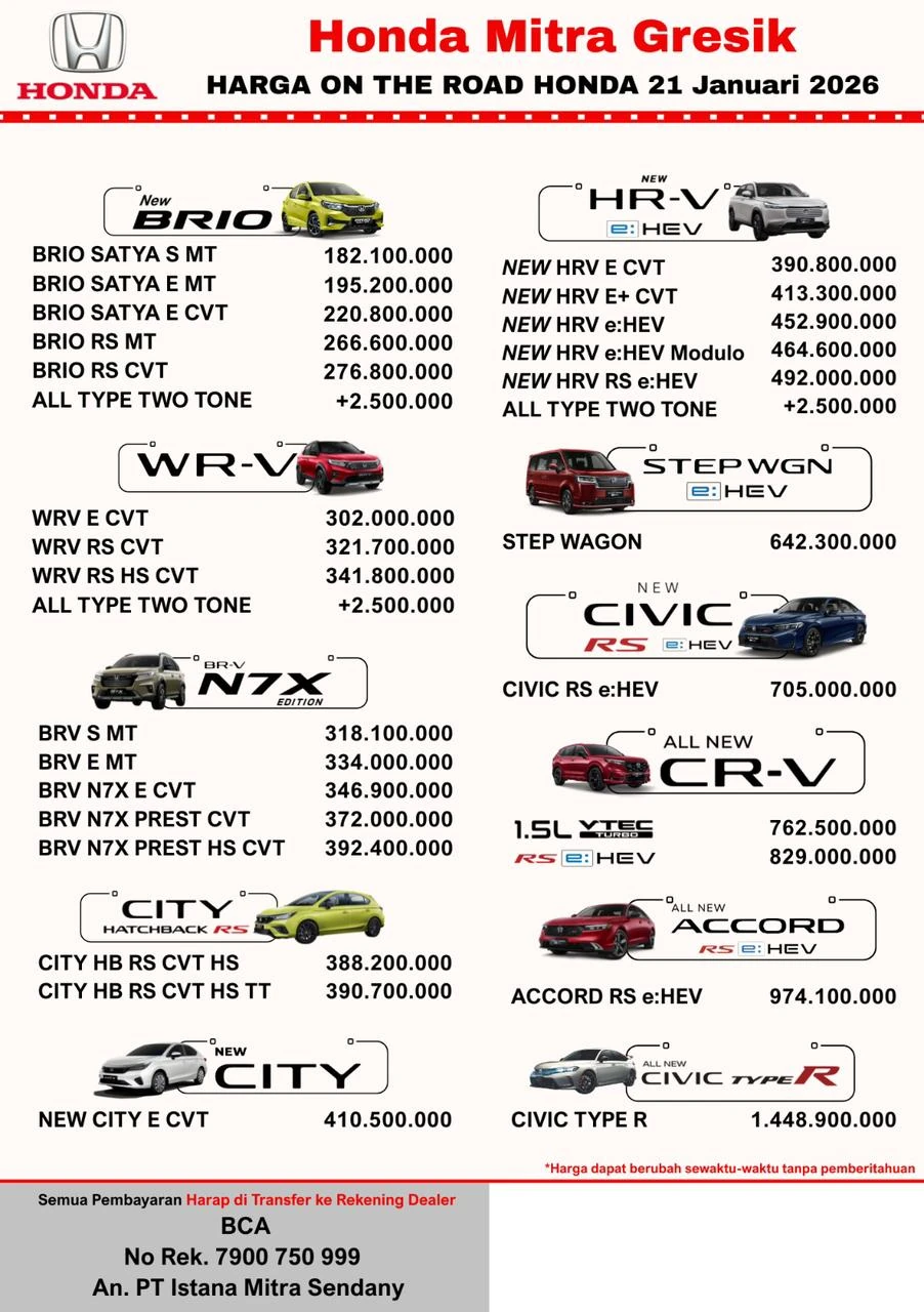 Berikut ini daftar harga OTR mobil Honda wilayah Gresik dan sekitarnya